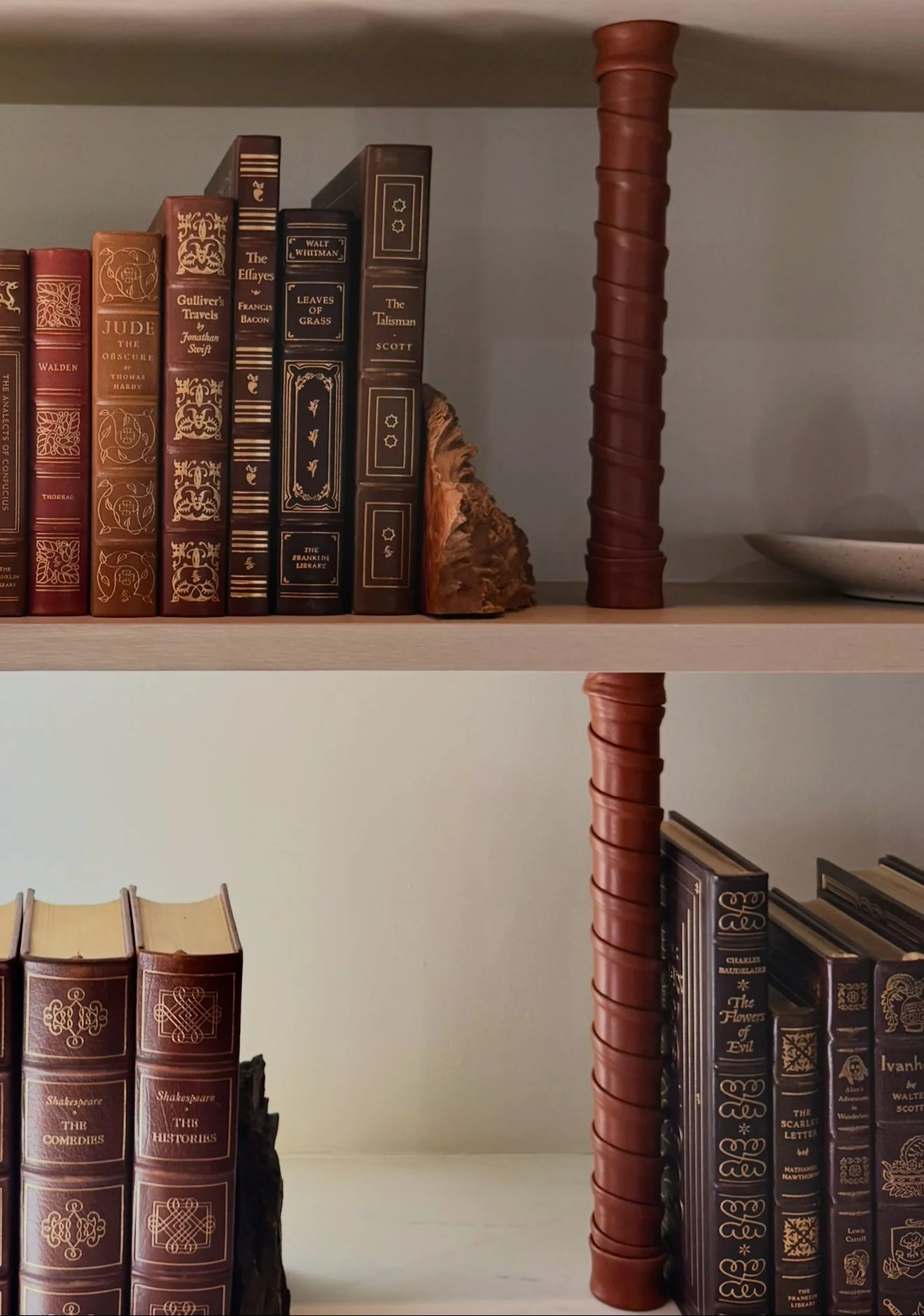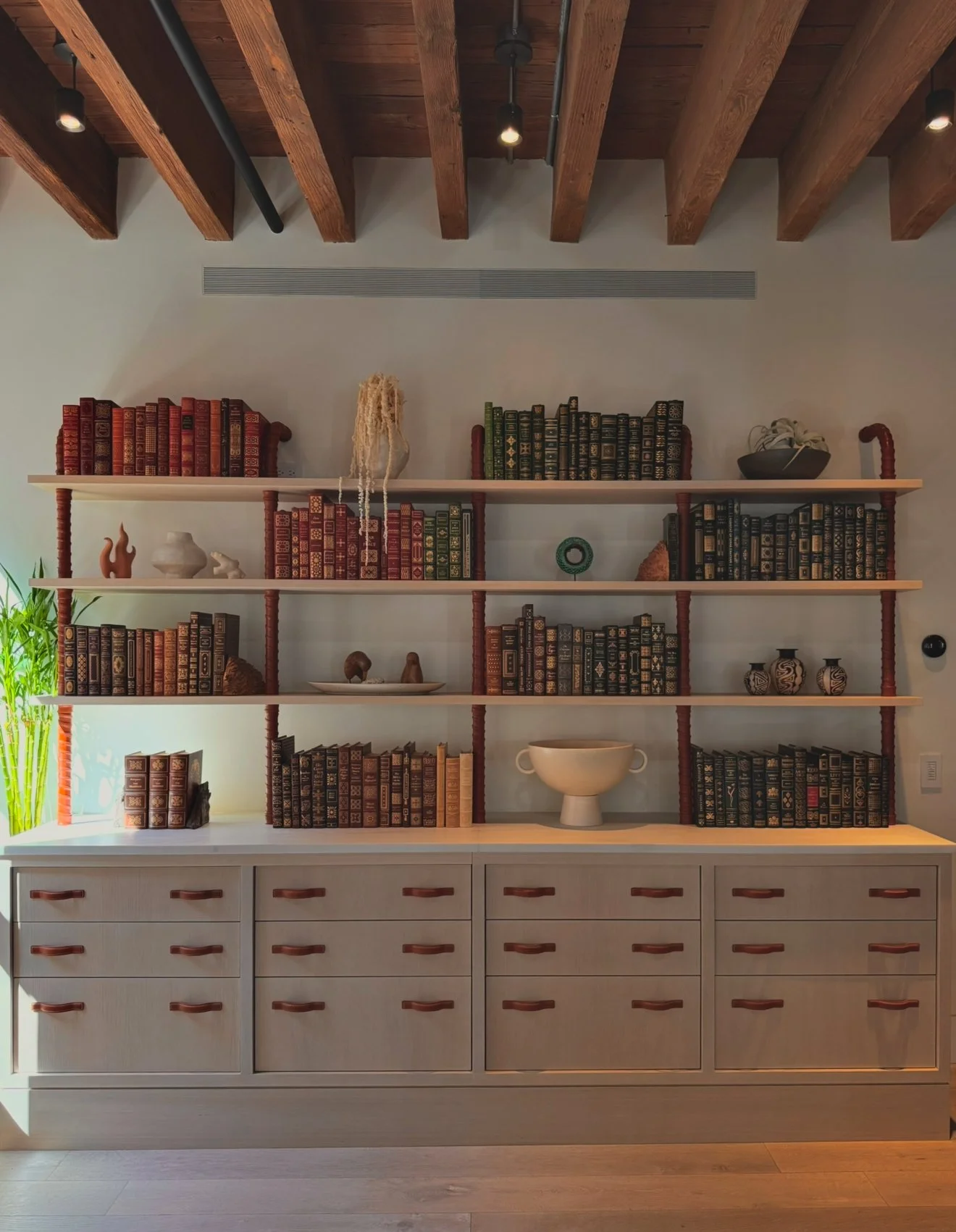 A custom library with leather pulls and wrapped pole details, precisely designed for the Tribeca Apartment Project.